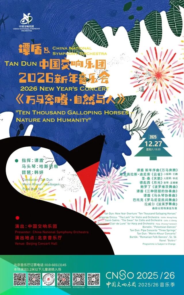 这首充满活力与喜庆气氛的《万马奔腾》是谭盾特别为2026年中国农历马年新年选取的新年序曲,并由其指挥中国交响乐团在新年音乐会上隆重演出。作品以奔腾的骏马为意象,通过激昂的节奏、丰富的管弦乐色彩和鲜明的中国音乐元素,展现出万马驰骋、气势恢宏的节日场景。谭盾巧妙融合了传统民间旋律与现代作曲技法,音乐中既有如风般磅礴的热闹,也有深情悠扬的抒怀,象征着新年伊始的蓬勃生机与奋进。整部作品犹如一幅音乐画卷,描绘了马年新春万象更新、豪情万丈的景象,传递出对未来的美好祝愿。