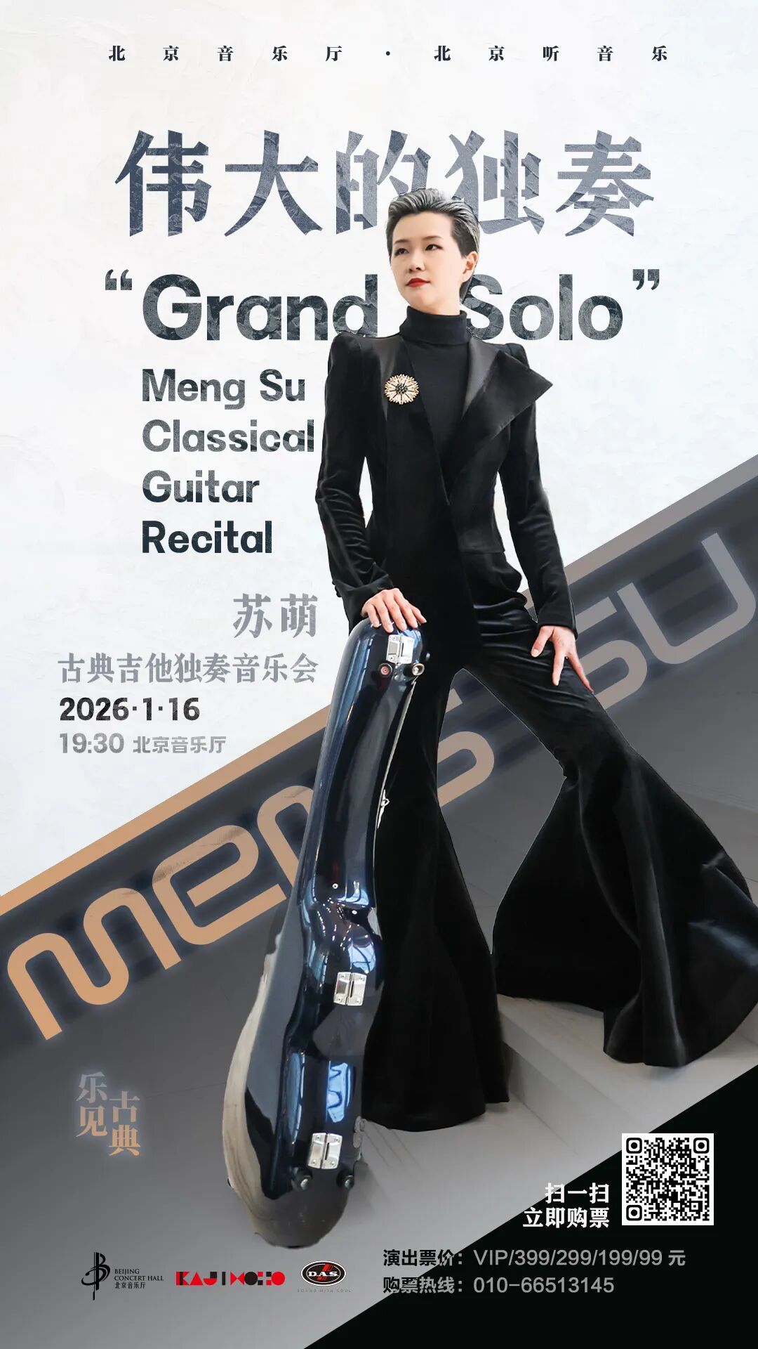 2026年1月16日晚,著名吉他演奏家苏萌将登上北京音乐厅的舞台,呈现一场主题为“伟大的独奏”的古典吉他独奏音乐会。届时,苏萌凭一人一琴,在极简的舞台上,展开一段跨越巴洛克至当代的音乐旅程,充分展现古典吉他所蕴含的深度、力量与精神张力。