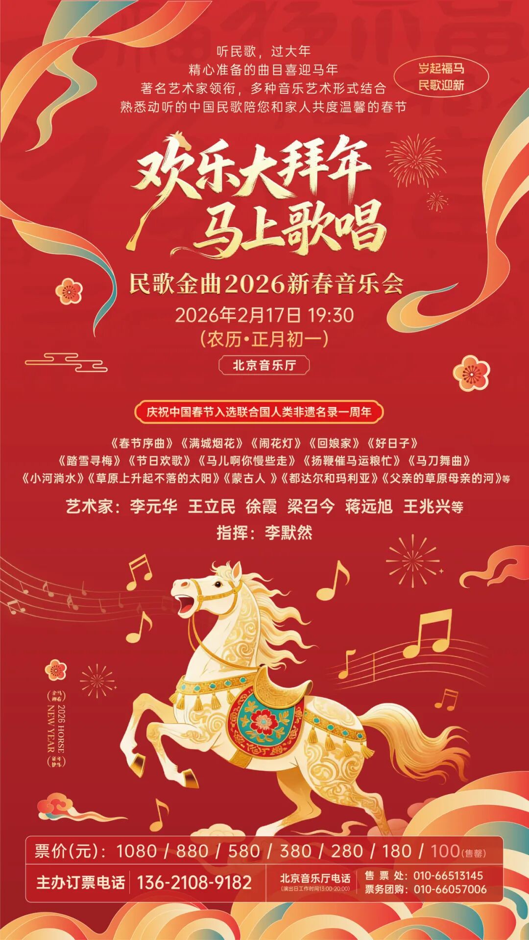 当乙巳岁末的钟声渐远,丙午马年的蹄音踏春而来;当中国春节申遗成功一周年的荣光与新春的喜庆撞个满怀,一场浸润着中华文脉、流淌着人间烟火的民歌盛宴,即将于北京音乐厅璀璨启幕。2026年2月17日(农历正月初一)19:30,“欢乐大拜年•马上歌唱——民歌金曲2026新春音乐会”邀您与家人共赴一场年味儿与艺术交织的新春之约。