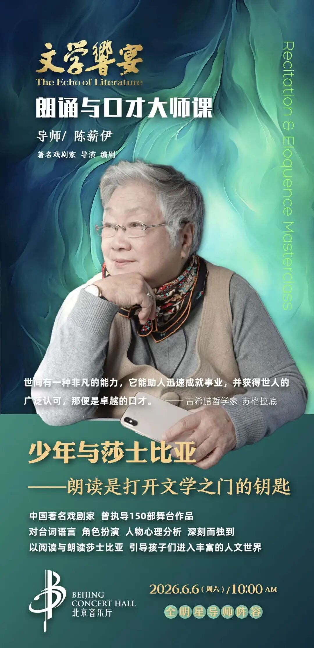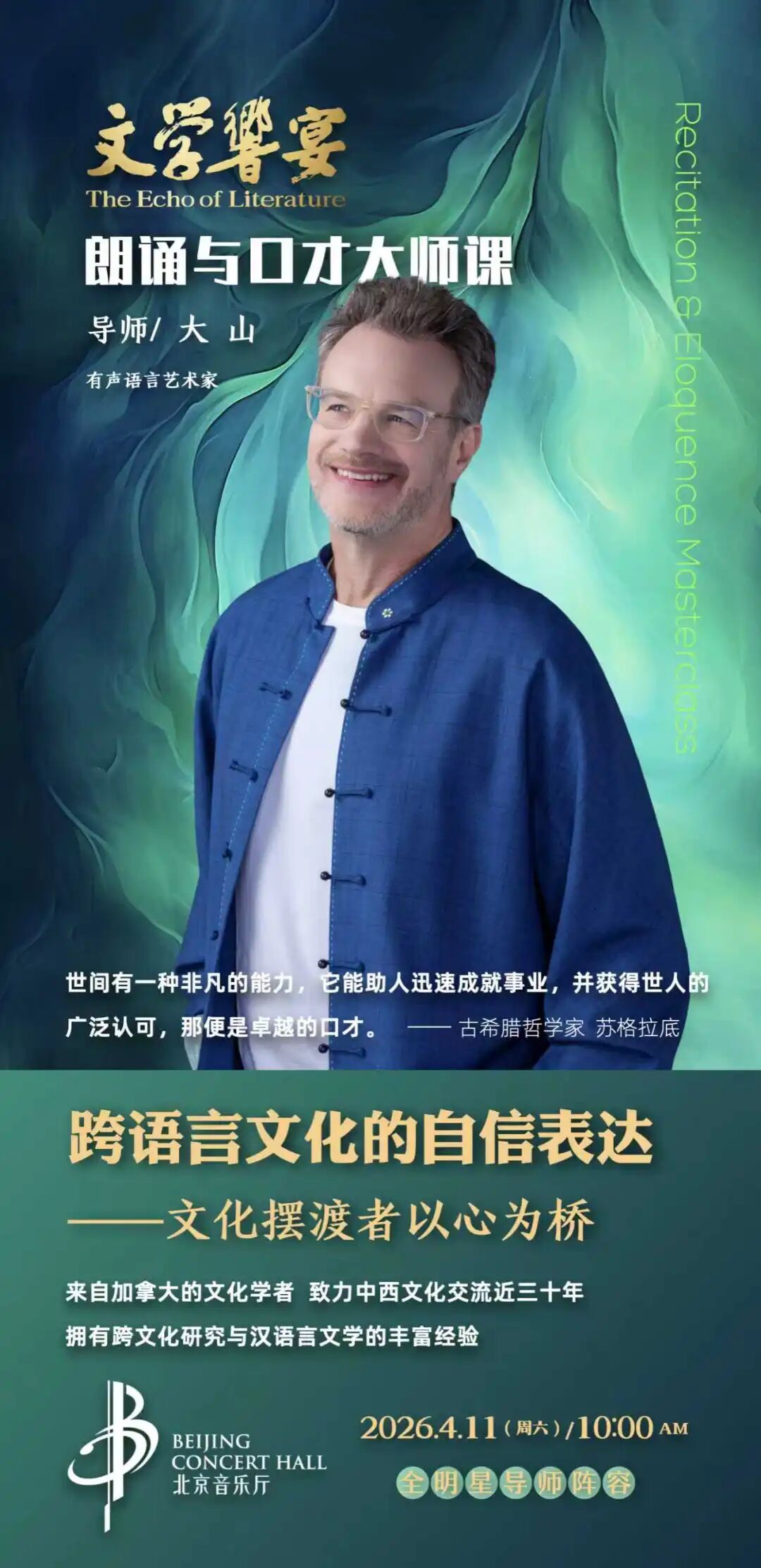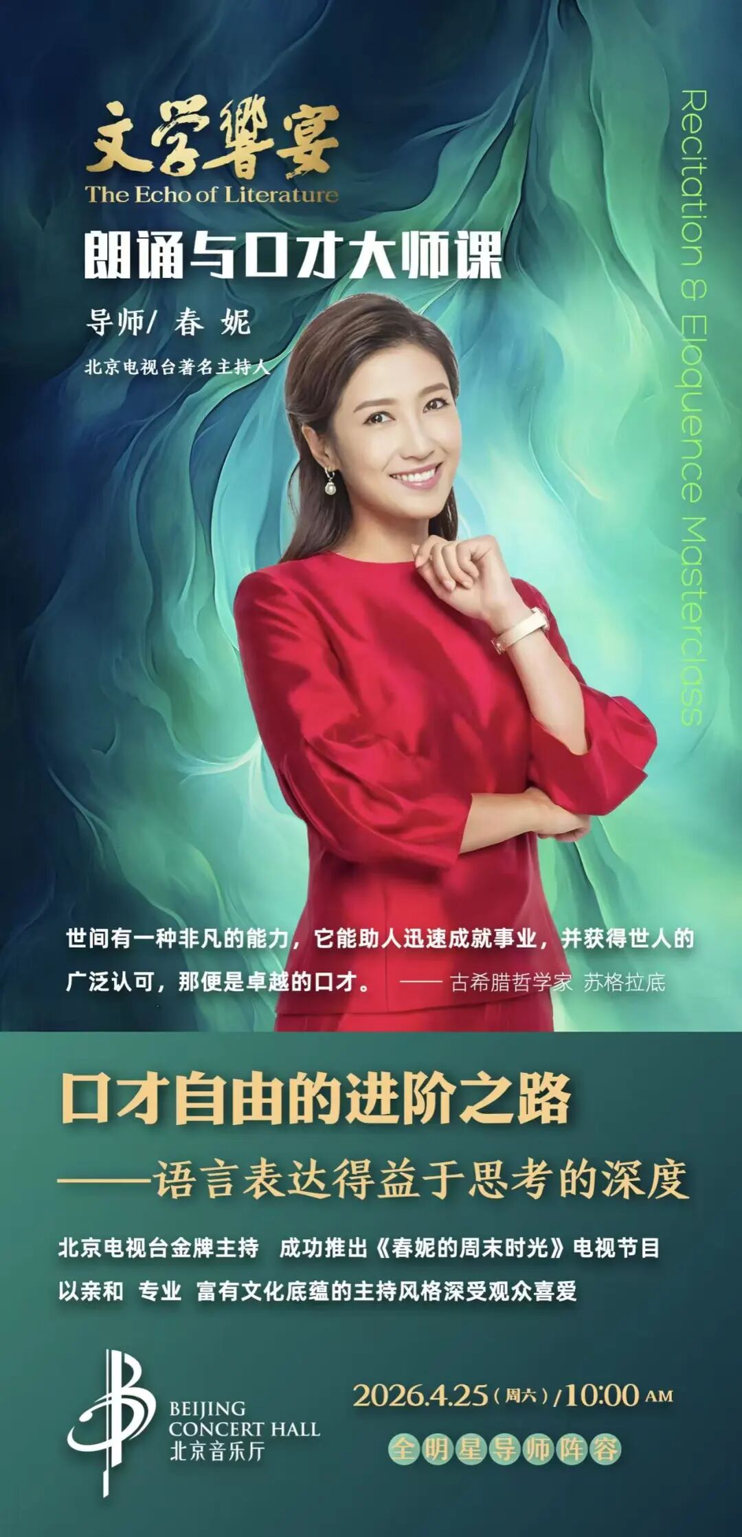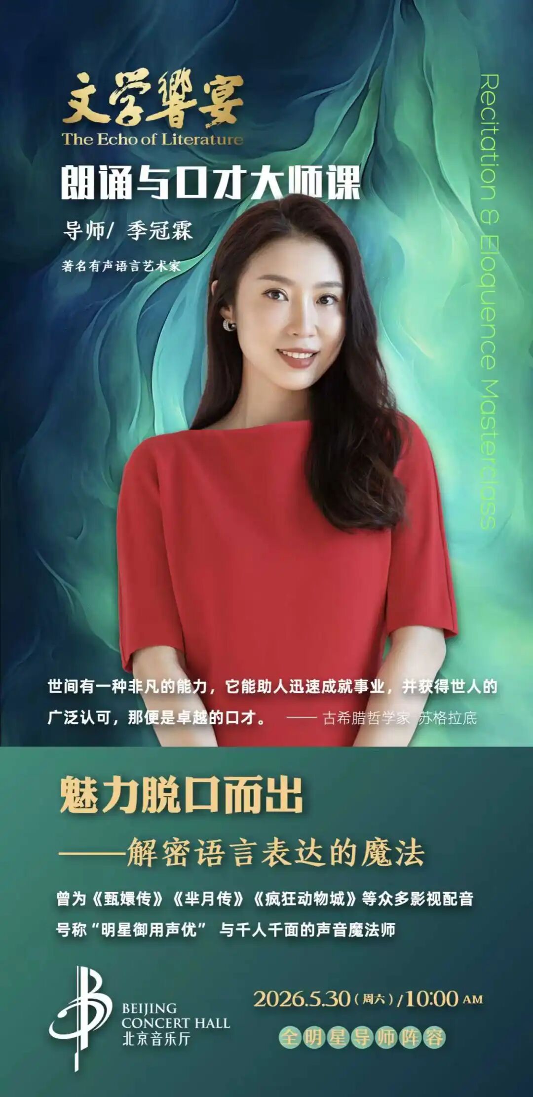 《文学响宴——朗诵与口才大师课》将在2月4日正式开票,首场大师课于3月14日北京音乐厅开讲。