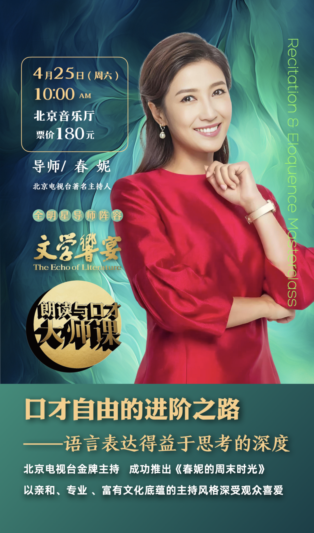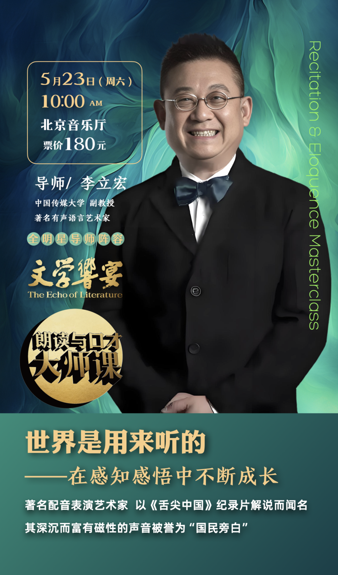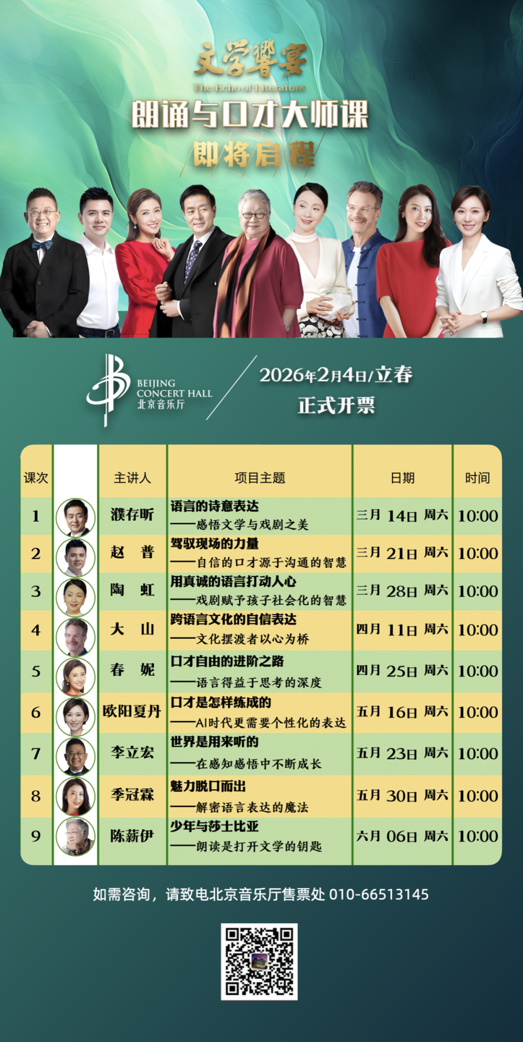 《文学响宴——朗诵与口才大师课》自2026年3月14日起,至6月6日结束,在北京音乐厅,每周末将有一位与语言艺术密切相关的重量级导师走上讲坛,连续9周,构成一个完整的语言素养提升的美育体系。每堂课不仅有案例分享、名家示范、技巧拆解,更注重思维启发与心灵对话。